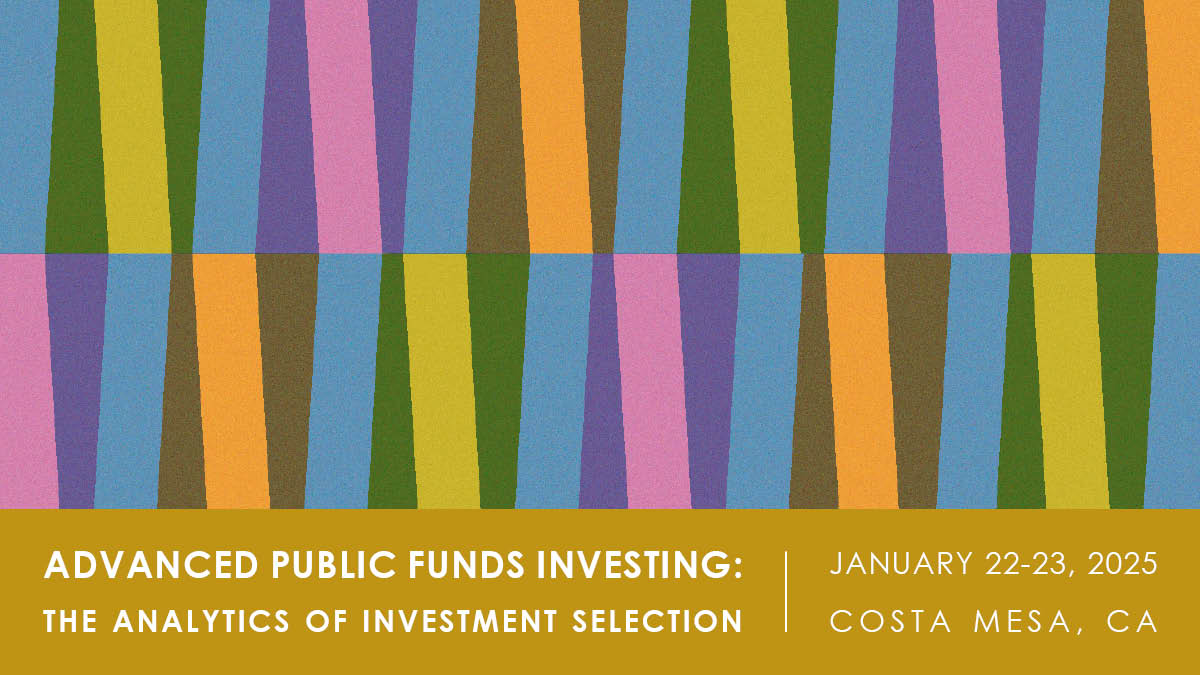 This two-day seminar builds from the fundamentals of public funds investing to cover more advanced concepts underlying sound public portfolio decision-making. The program will focus on identifying the risks and understanding the features of each of the permissible investment securities in the context of investment strategies. The program will conclude by providing a tutorial of various investment database tools.